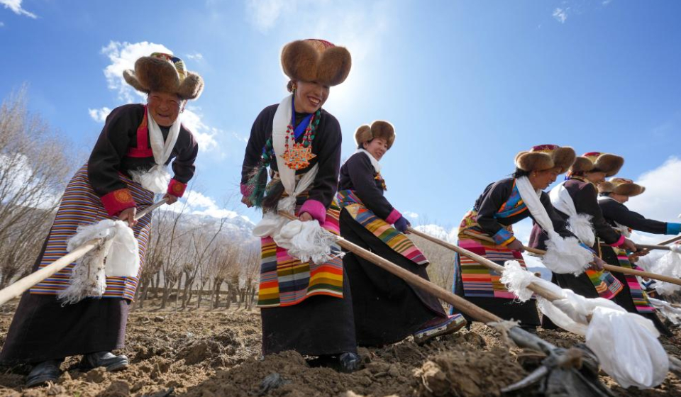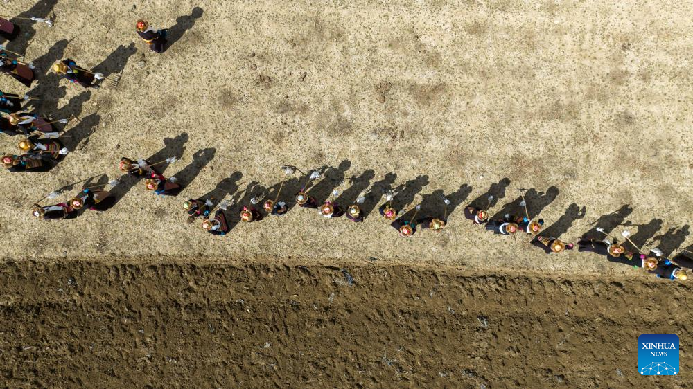 Villagers, dressed in traditional attires, participate in a ceremony marking the start of spring farming in Gaiba Village of Shannan City, southwest China's Xizang Autonomous Region, March 16, 2026. Ceremonies marking the start of spring farming were held across Xizang on Monday. The ceremony holds great significance as it marks the beginning of a new year's farming season and serves as a prayer for favorable weather and bountiful harvests. It is considered an important ritual in the farming regions of Xizang. Over 200 villagers, dressed in traditional attires, participated in the ceremony held in Gaiba Village of Shannan. (Xinhua/Jigme Dorje)