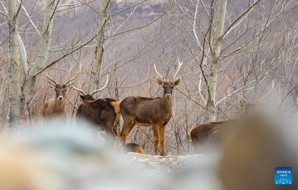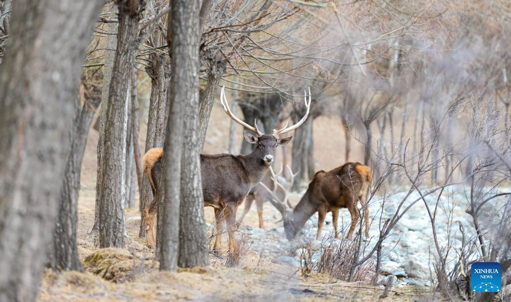 White-lipped deer, a national first-class protected species, are pictured in Gaiba Village of Nedong District in Shannan City, southwest China's Xizang Autonomous Region, March 15, 2026. The population of white-lipped deer has gradually increased with the continuous improvement of the local ecological environment and strengthened biodiversity conservation efforts, serving as a vivid example of ecological development on the plateau. (Xinhua/Jigme Dorje)