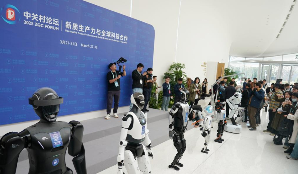 Journalists take photos of humanoid robots at Zhongguancun International Innovation Center, venue for the 2025 Zhongguancun Forum (ZGC Forum), in Beijing, capital of China, March 26, 2025. (Xinhua/Zhang Chenlin)