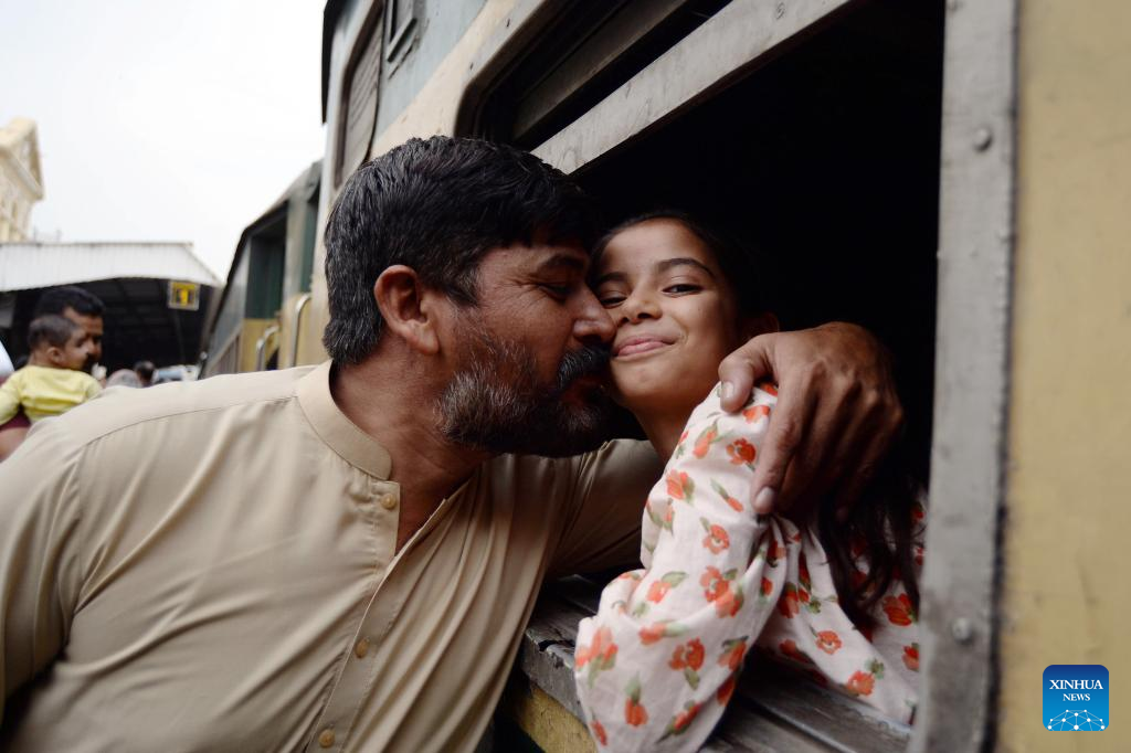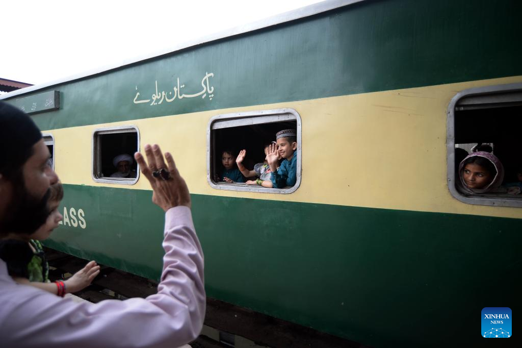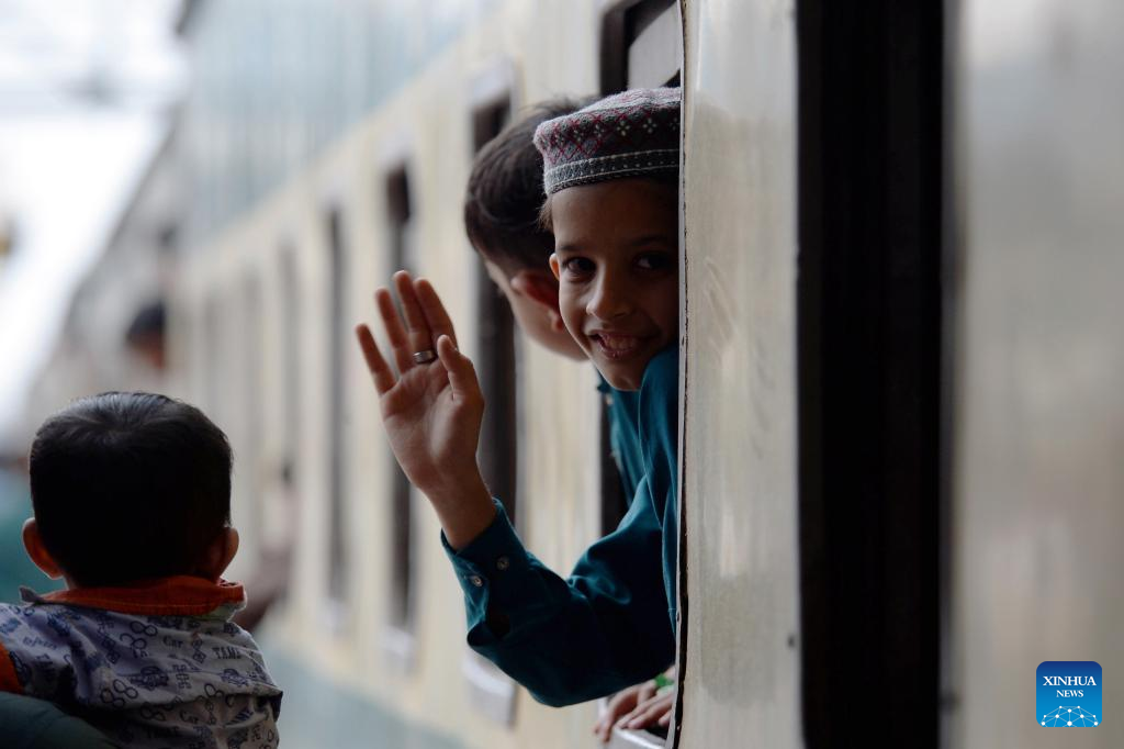 People take a train to head to their hometowns for the upcoming Eid al-Fitr in Karachi, Pakistan on March 18, 2026. (Str/Xinhua)