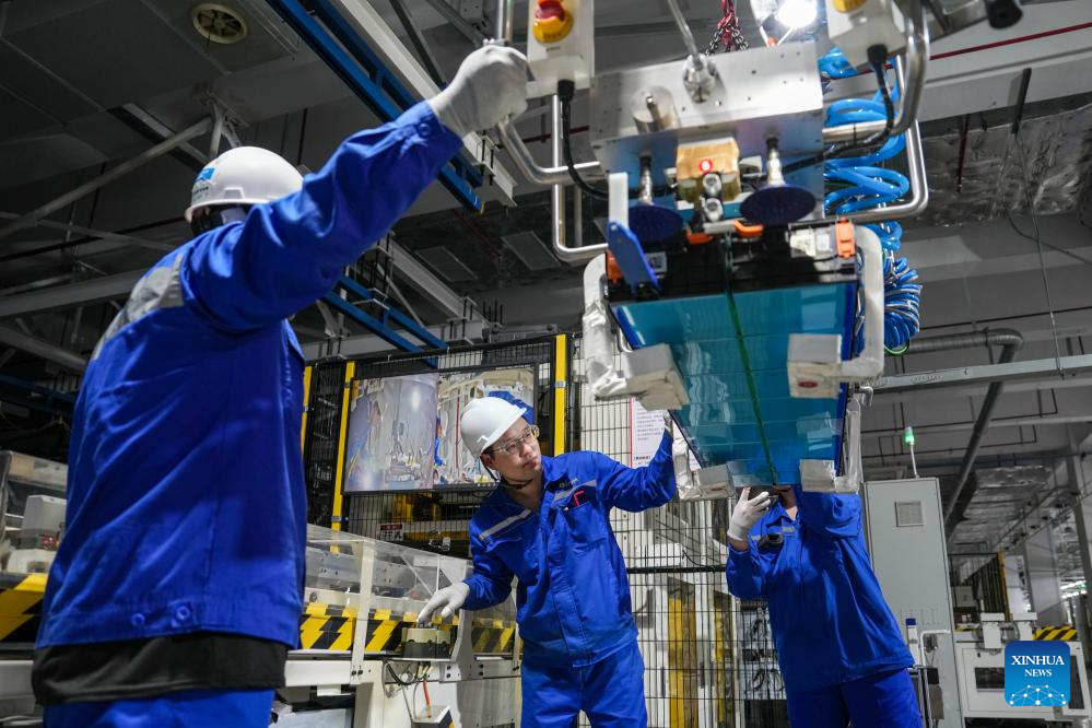 Staff members work on an assembly line of new energy vehicle battery module at a company co-established by Chinese battery giant CATL and automaker SAIC Motor in Changzhou, east China's Jiangsu Province, June 11, 2025. (Xinhua/Li Bo)