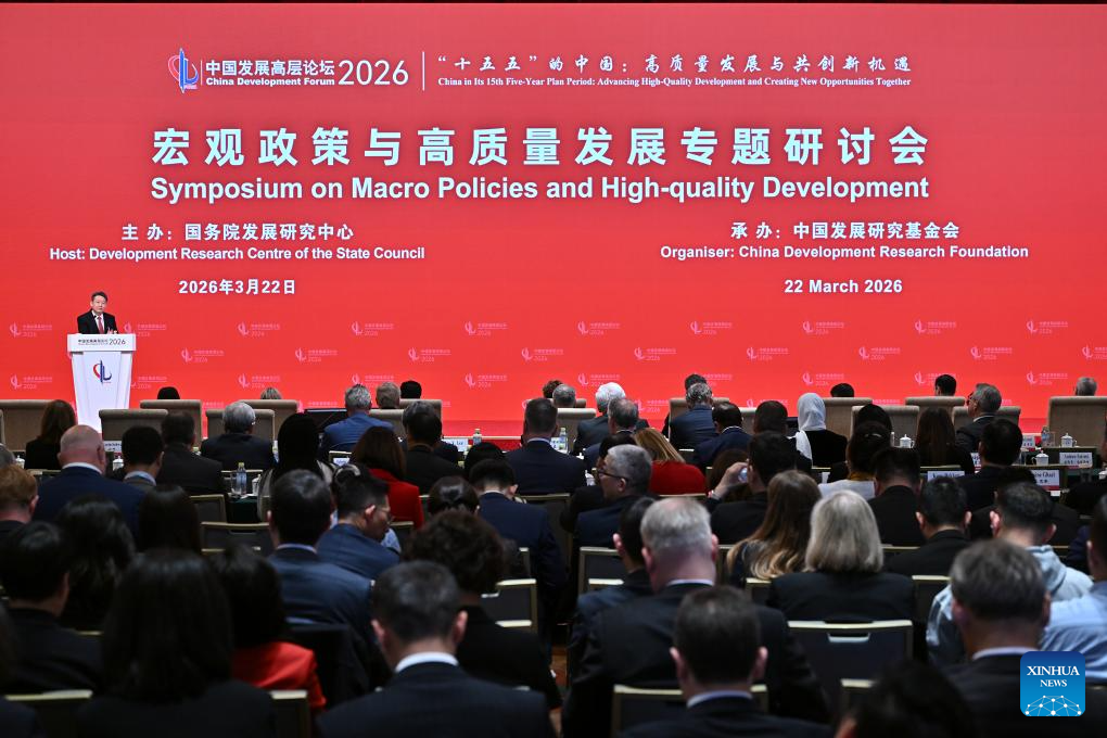 This photo taken on March 22, 2026 shows a symposium on macro policies and high-quality development during the China Development Forum 2026 in Beijing, capital of China. The China Development Forum 2026 kicked off in Beijing on Sunday. The theme of this year's forum is "China in Its 15th Five-Year Plan Period: Advancing High-Quality Development and Creating New Opportunities Together." (Xinhua/Li Xin)