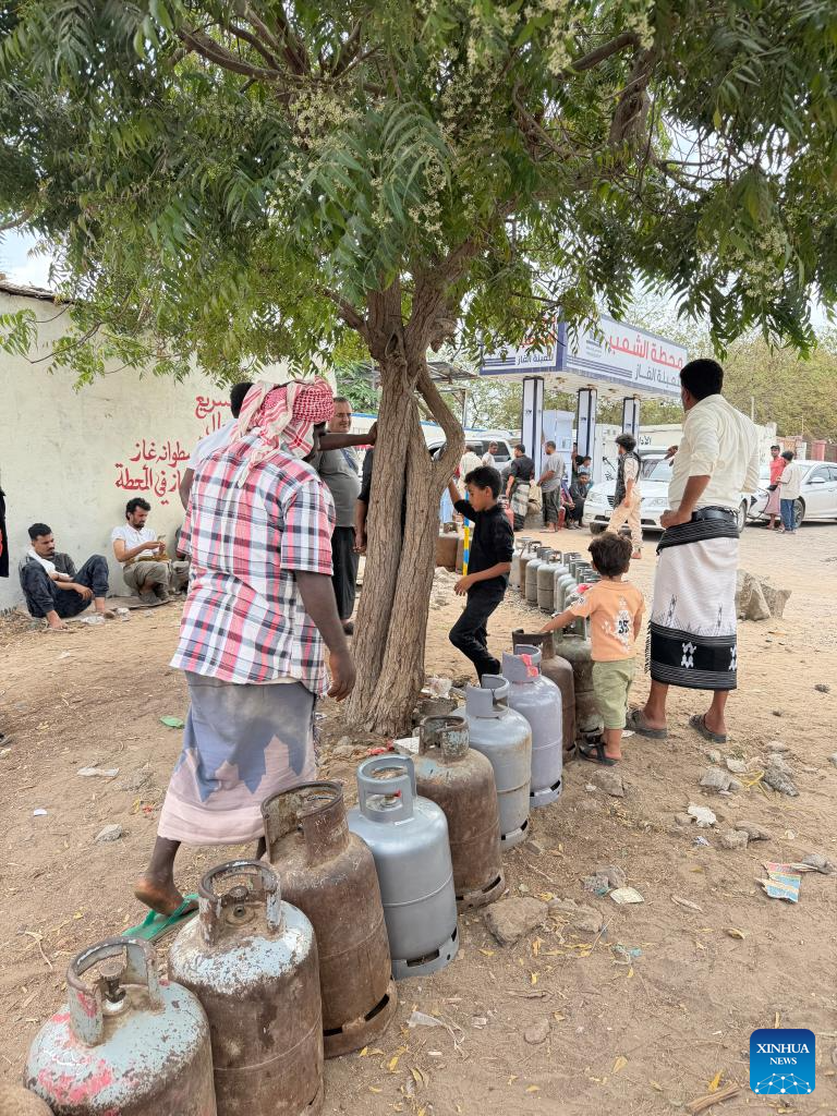 Photo taken by cellphone shows residents standing near lines of cooking gas cylinders under a tree as they await refills in the southern port city of Aden, Yemen, March 24, 2026. A fresh rise in prices of essential goods and services is deepening economic hardship in war-ravaged Yemen, as households face mounting costs stemming from supply disruptions, higher import expenses and recent policy adjustments affecting key commodities. (Photo by Murad/Xinhua)