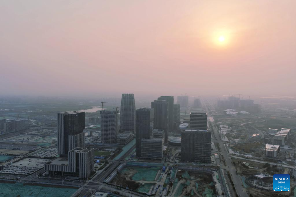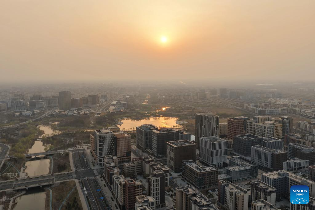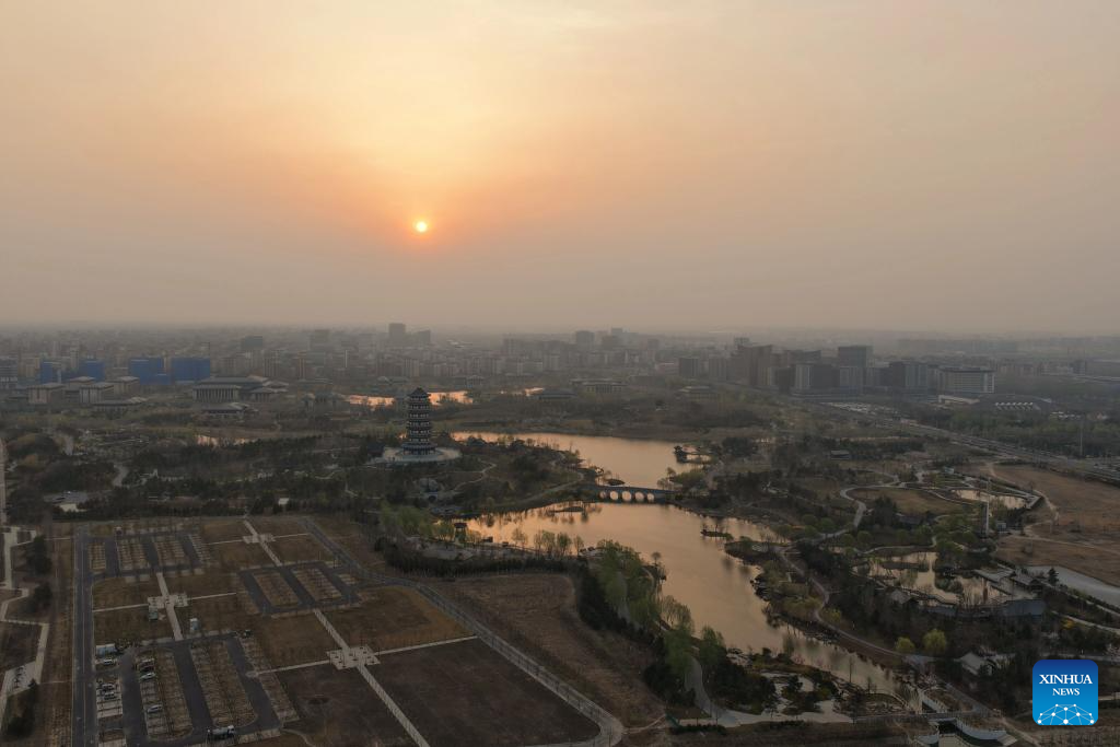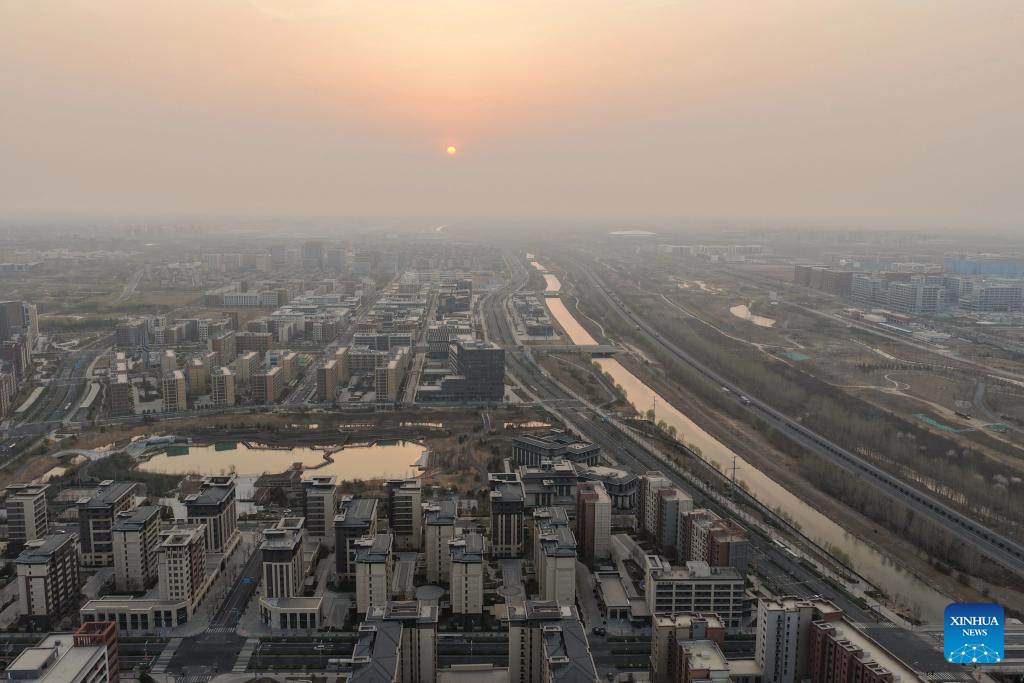 An aerial drone photo taken on March 27, 2026 shows the sunrise scenery in Xiong'an New Area, north China's Hebei Province. (Xinhua/Xing Guangli)