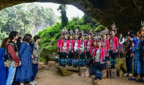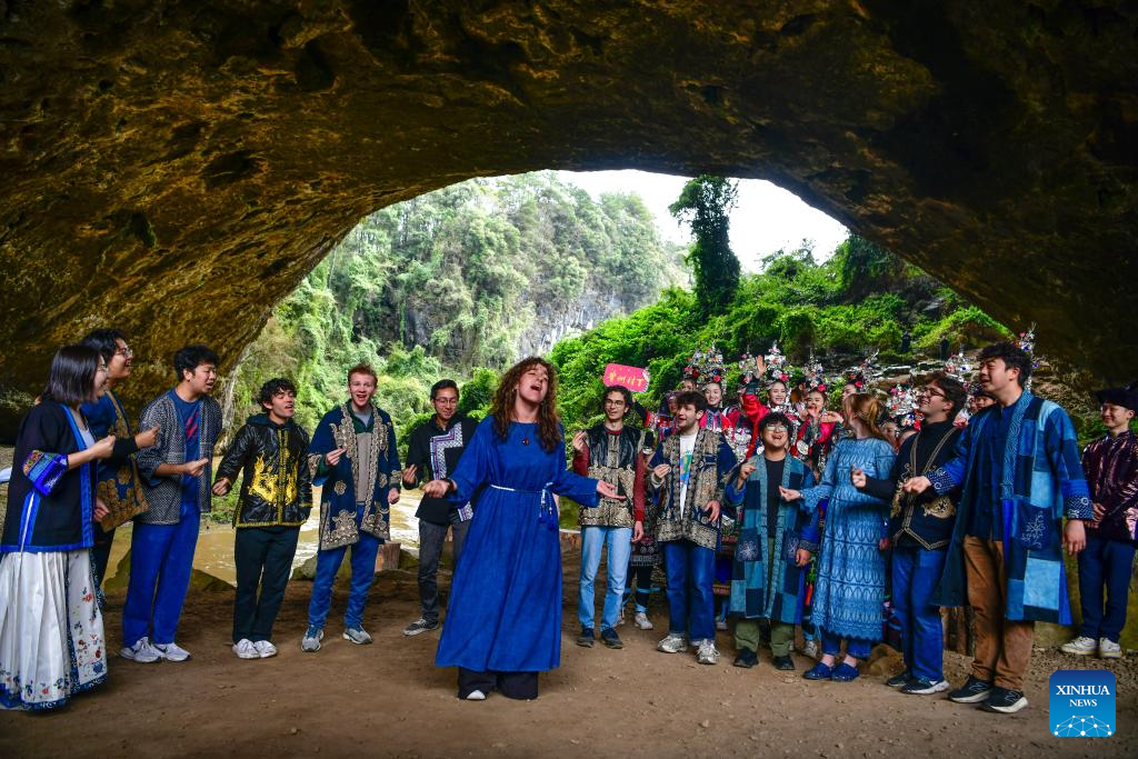 Performers sing a grand song of the Dong ethnic group at a scenic area in Liping County, southwest China's Guizhou Province, March 24, 2026. The Whiffenpoofs a cappella choir of Yale University visited Liping County in southwest China's Guizhou Province from March 23 to 24 for cultural exchange activities. (Xinhua/Yang Wenbin)