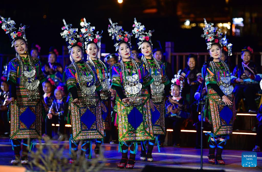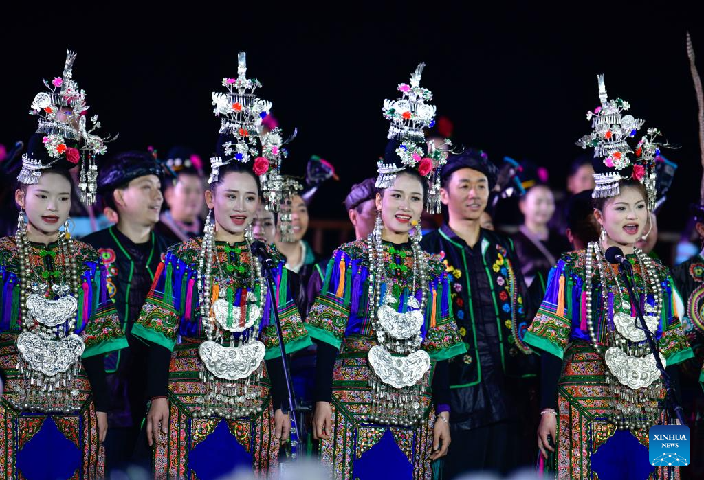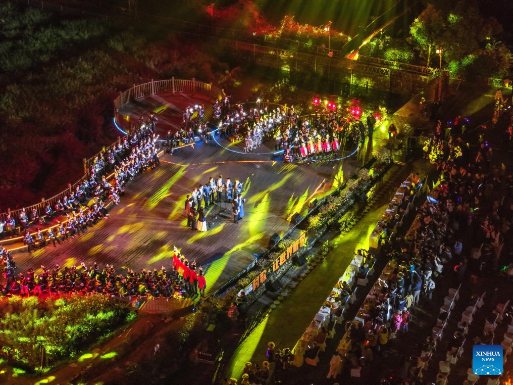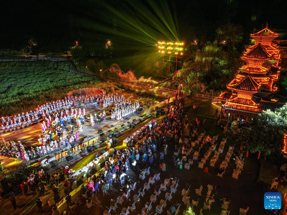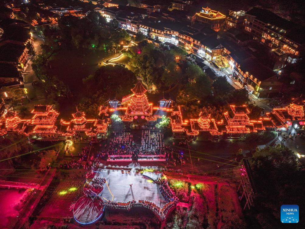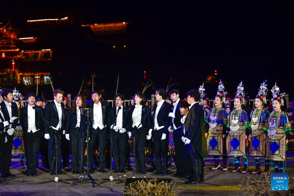 An aerial drone photo taken on March 23, 2026 shows a view of a cultural exchange gala at Zhaoxing Dong Village of Liping County, southwest China's Guizhou Province. The Whiffenpoofs a cappella choir of Yale University visited Liping County in southwest China's Guizhou Province from March 23 to 24 for cultural exchange activities. (Xinhua/Yang Wenbin)