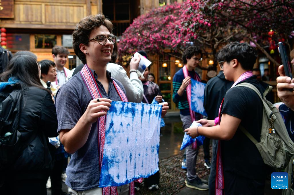 A member of the Whiffenpoofs a cappella choir of Yale University shows his batik work at Zhaoxing Dong Village of Liping County, southwest China's Guizhou Province, March 23, 2026. The Whiffenpoofs a cappella choir of Yale University visited Liping County in southwest China's Guizhou Province from March 23 to 24 for cultural exchange activities. (Xinhua/Yang Wenbin)