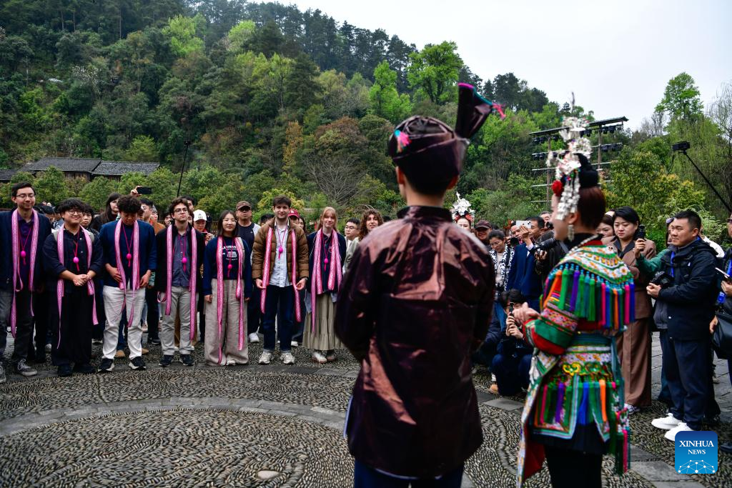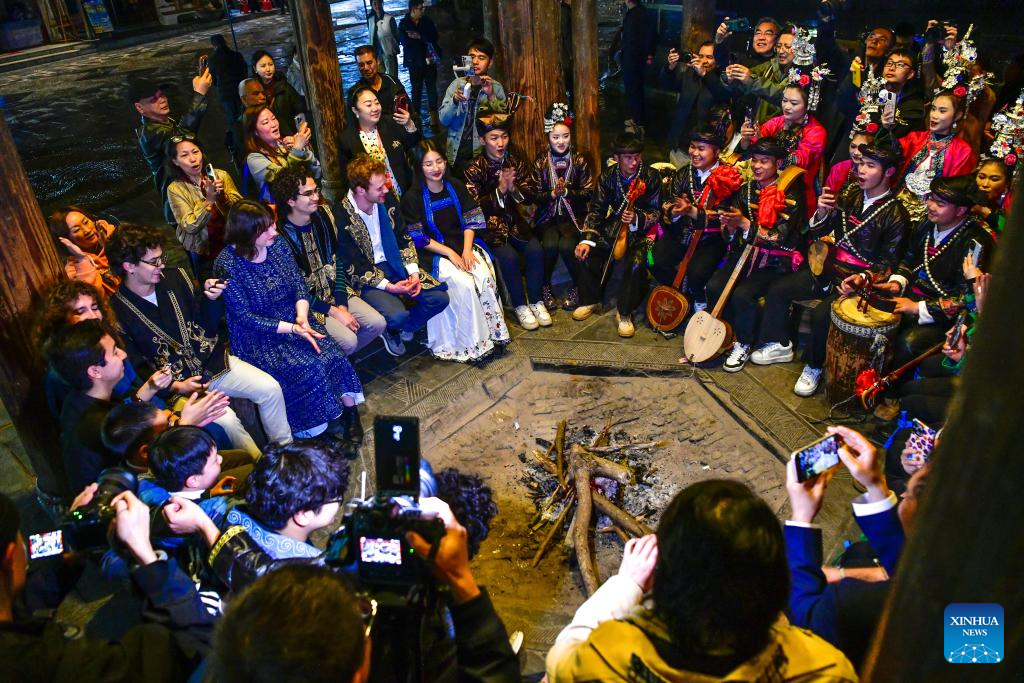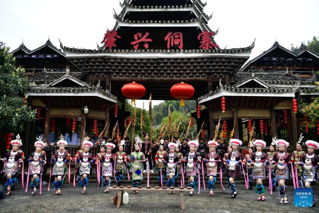 Local residents welcome guests at Zhaoxing Dong Village of Liping County, southwest China's Guizhou Province, March 23, 2026. The Whiffenpoofs a cappella choir of Yale University visited Liping County in southwest China's Guizhou Province from March 23 to 24 for cultural exchange activities. (Xinhua/Yang Wenbin)