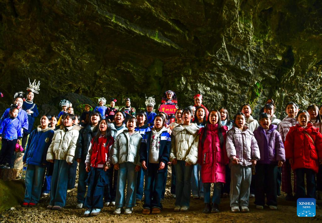 Children sing a song of the Dong ethnic group at a scenic area in Liping County, southwest China's Guizhou Province, March 24, 2026. The Whiffenpoofs a cappella choir of Yale University visited Liping County in southwest China's Guizhou Province from March 23 to 24 for cultural exchange activities. (Xinhua/Yang Wenbin)