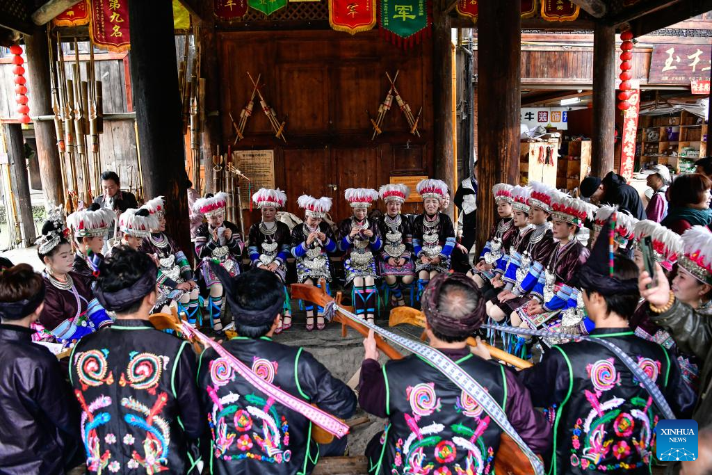 Villagers rehearse a song of the Dong ethnic group to welcome guests at Zhaoxing Dong Village of Liping County, southwest China's Guizhou Province, March 23, 2026. The Whiffenpoofs a cappella choir of Yale University visited Liping County in southwest China's Guizhou Province from March 23 to 24 for cultural exchange activities. (Xinhua/Yang Wenbin)