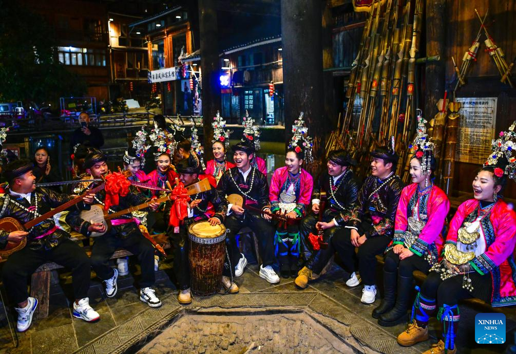 Members of a local choir sing a grand song of the Dong ethnic group at Zhaoxing Dong Village of Liping County, southwest China's Guizhou Province, March 23, 2026. The Whiffenpoofs a cappella choir of Yale University visited Liping County in southwest China's Guizhou Province from March 23 to 24 for cultural exchange activities. (Xinhua/Yang Wenbin)