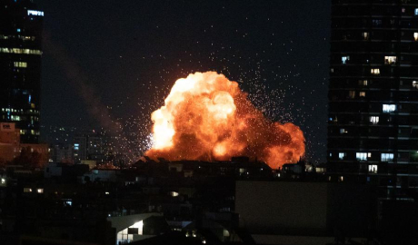 This photo taken on Feb. 28, 2026 shows an explosion during missile strikes by Iran in downtown Tel Aviv, Israel. (Xinhua/Chen Junqing)