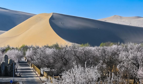 Apricot blossoms bloom beneath Mingsha Mountain in Dunhuang