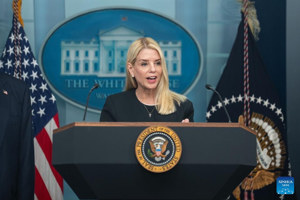 U.S. President Donald Trump said Thursday on social media that Attorney General Pam Bondi will step down from her position and Deputy Attorney General Todd Blanche will serve as acting attorney general. This file photo taken on June 27, 2025 shows Pam Bondi speaking during a press conference at the White House in Washington, D.C., the United States. (Xinhua/Hu Yousong)