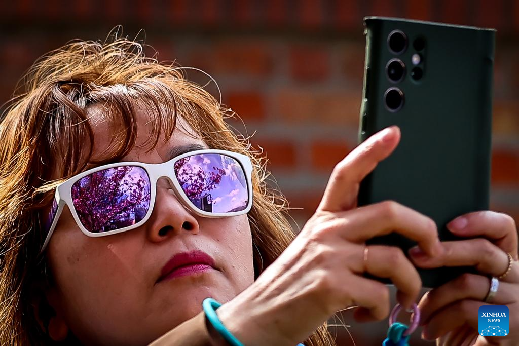 A visitor takes photos of cherry blossoms at the Castle Hill in Budapest, Hungary, April 2, 2026. (Photo by David Balogh/Xinhua)