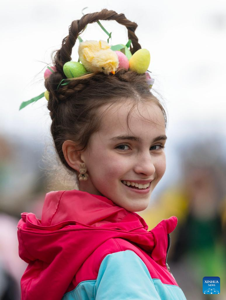 A girl with an Easter basket hairstyle is pictured during the 2026 Toronto Beaches Lions Easter Parade in Toronto, Canada, on April 5, 2026. (Photo by Zou Zheng/Xinhua)