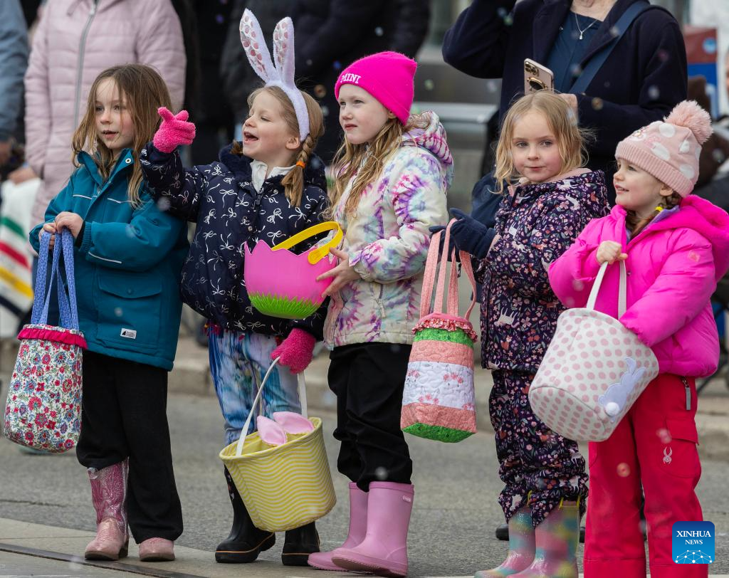 Children wait for candy distribution during the 2026 Toronto Beaches Lions Easter Parade in Toronto, Canada, on April 5, 2026. (Photo by Zou Zheng/Xinhua)