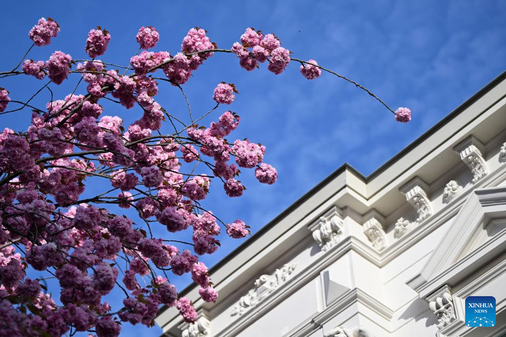 Blooming cherry blossoms are seen in Bonn, Germany, April 6, 2026. (Photo by Ulrich Hufnagel/Xinhua)