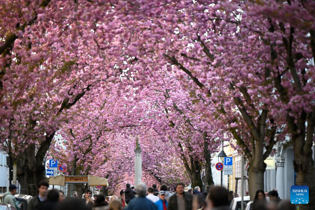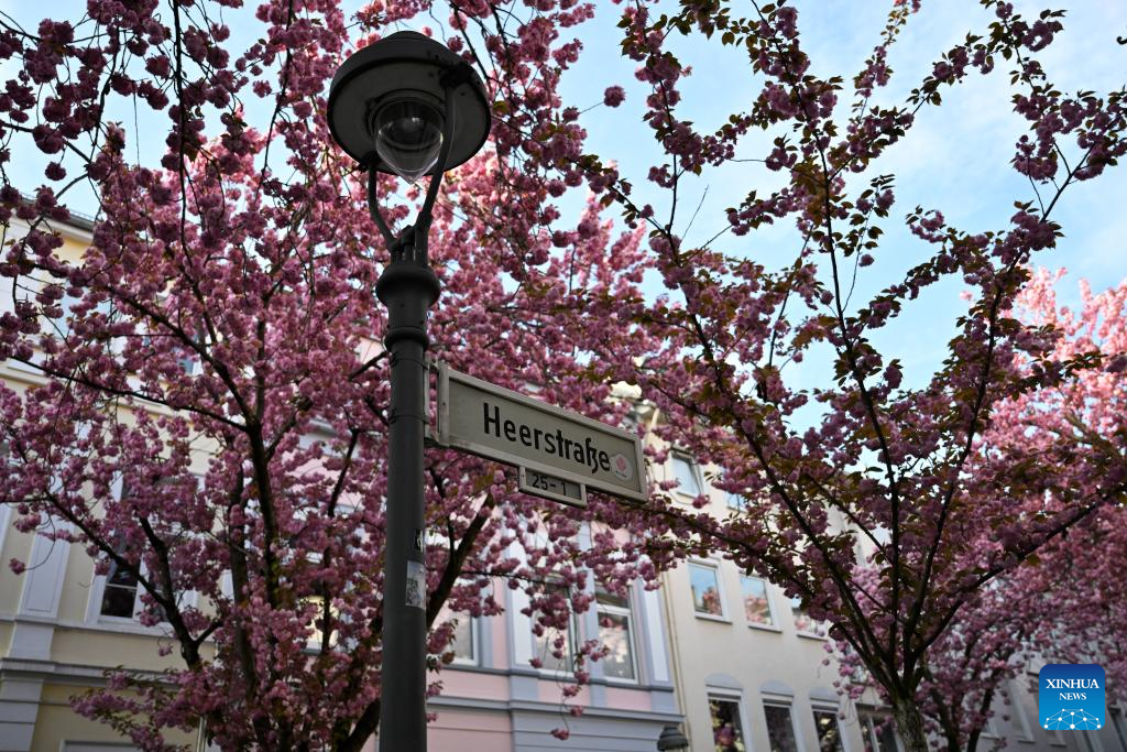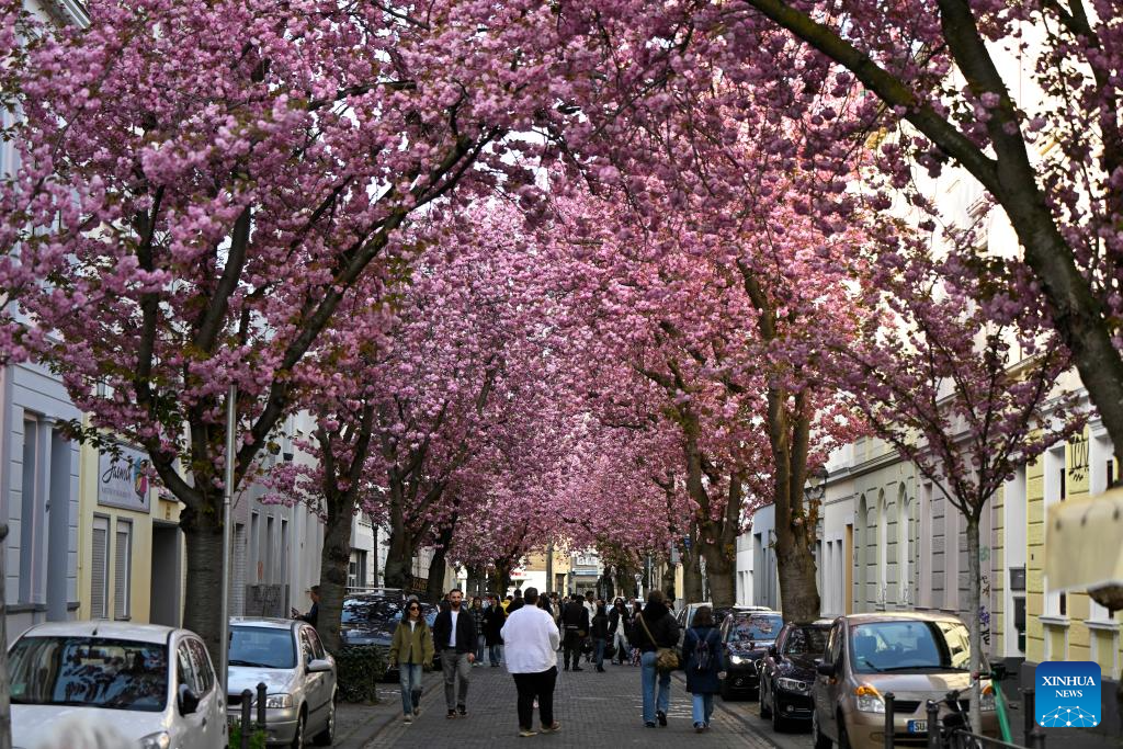 Pedestrians are pictured in a street with blooming cherry blossoms in Bonn, Germany, April 6, 2026. (Photo by Ulrich Hufnagel/Xinhua)
