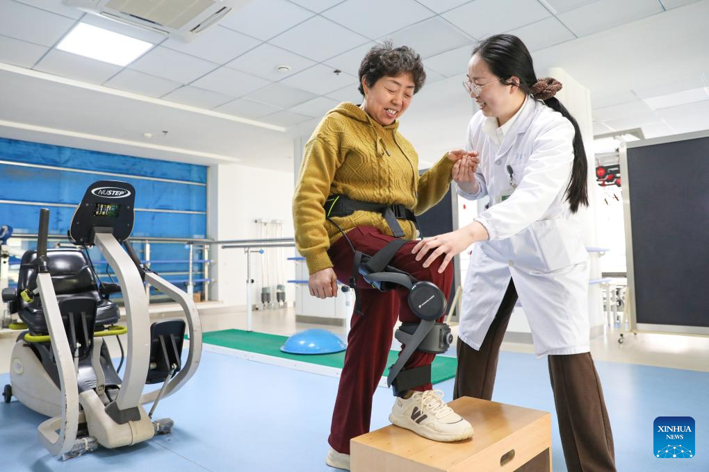 A patient wearing an exoskeleton robot conducts rehabilitation training under the guidance of a therapist at a traditional Chinese medicine hospital in Hai'an City, east China's Jiangsu Province, April 7, 2026. The World Health Day is observed annually on April 7, which marks the anniversary of the WHO's founding and raises awareness of pressing global health issues. (Photo by Gu Binbin/Xinhua)