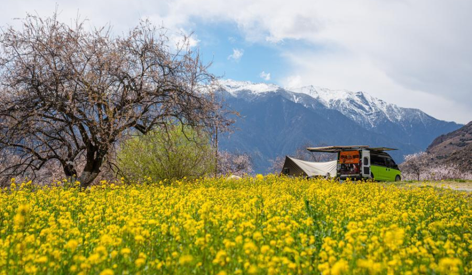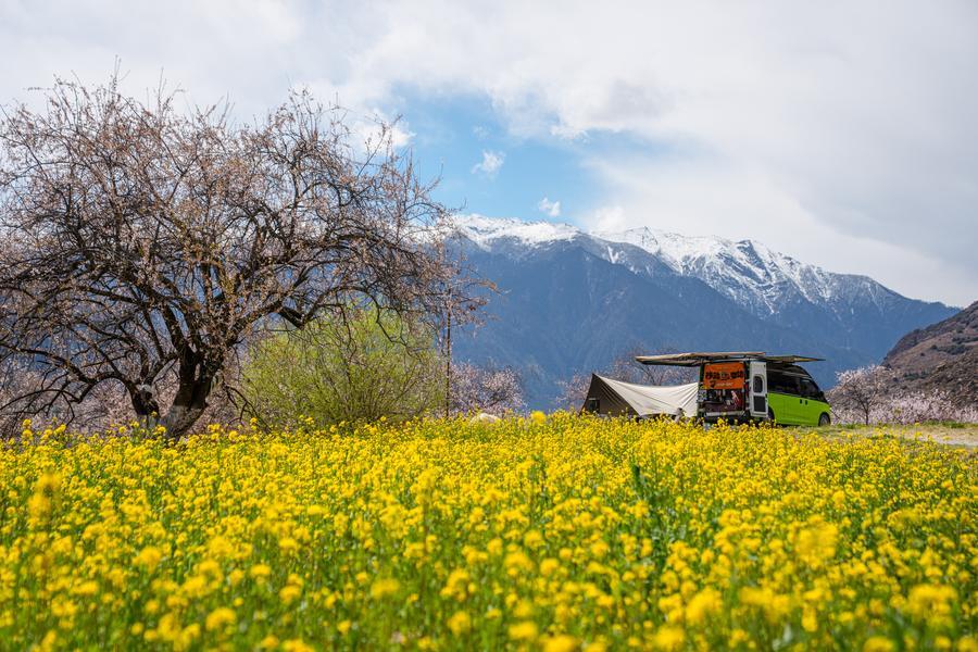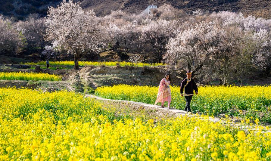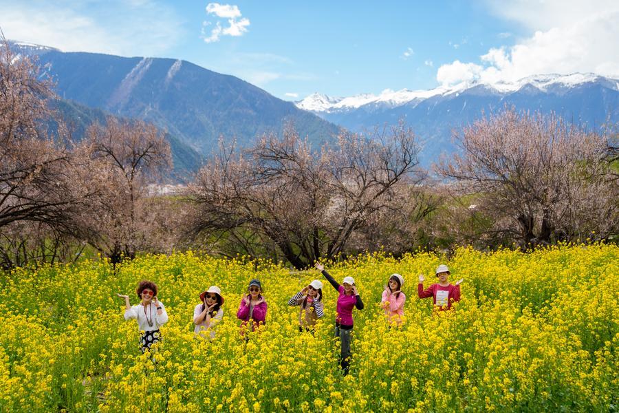 Tourists walk among blooming flowers in Duodang Village of Nyingchi City, southwest China's Xizang Autonomous Region, April 2, 2026. (Xinhua/Tenzin Nyida)