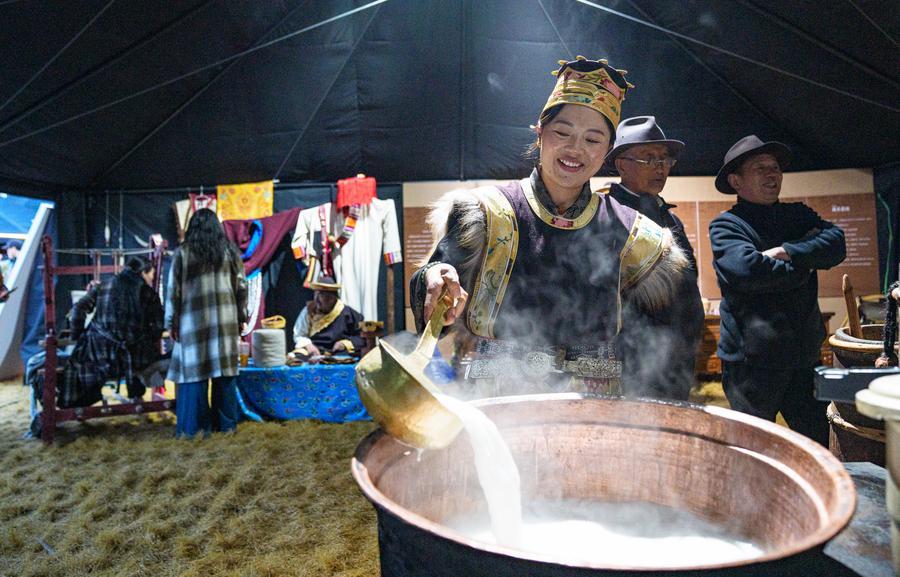 A staff member makes butter tea at a fair in Nyingchi City, southwest China's Xizang Autonomous Region, April 3, 2026. (Xinhua/Tenzin Nyida)