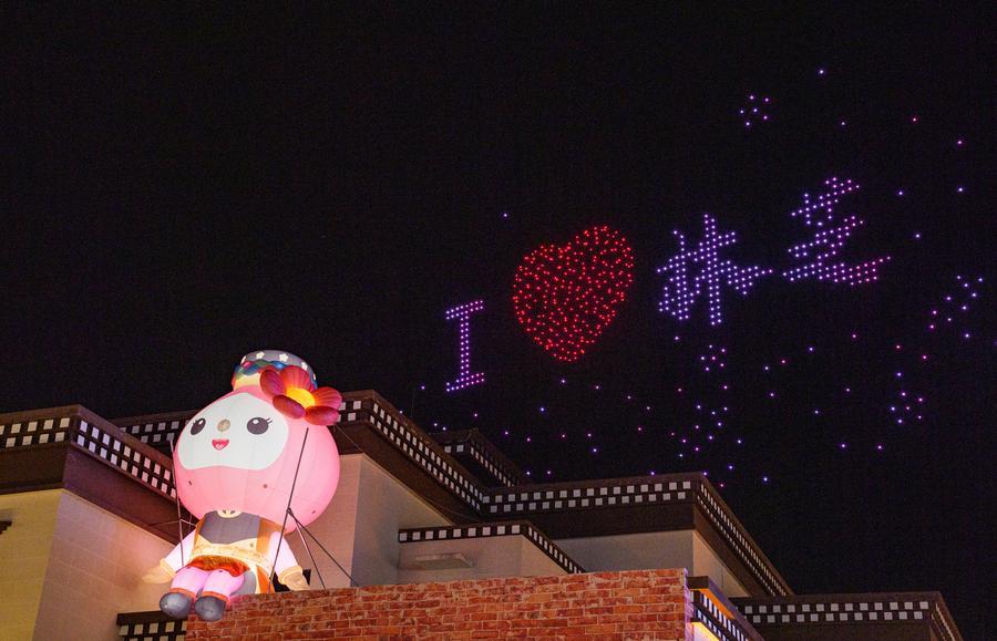 A drone light show is staged at the opening ceremony of a peach blossom tourism and cultural festival in Nyingchi City, southwest China's Xizang Autonomous Region, April 3, 2026. (Xinhua/Tenzin Nyida)