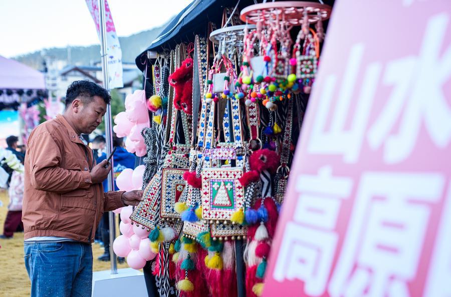 A tourist shops for handmade bags at a fair in Nyingchi City, southwest China's Xizang Autonomous Region, April 3, 2026. (Xinhua/Tenzin Nyida)