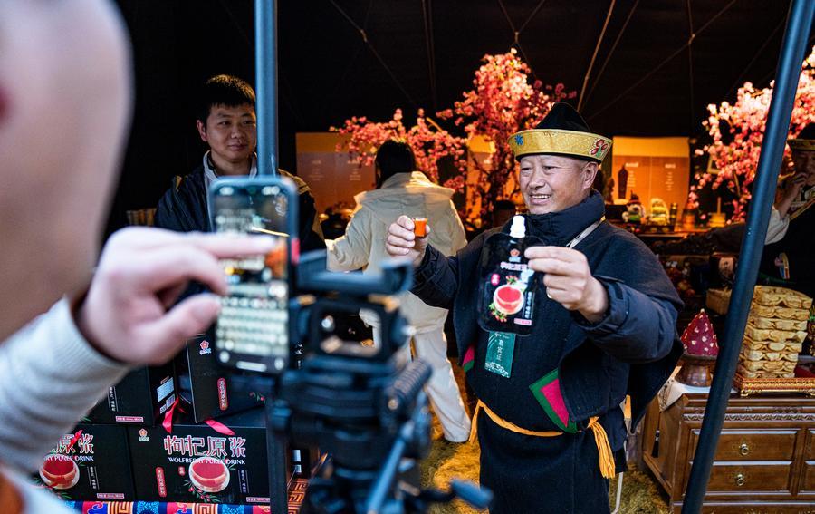 A staff member promotes goji berry puree products at a fair in Nyingchi City, southwest China's Xizang Autonomous Region, April 3, 2026. (Xinhua/Tenzin Nyida)