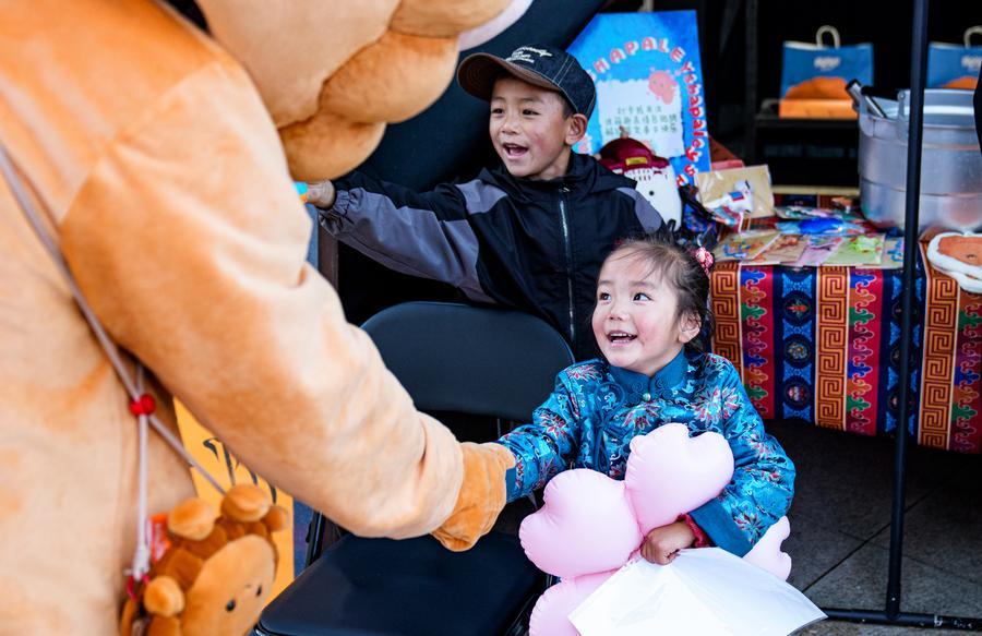 Children interact with a costumed performer at a fair in Nyingchi City, southwest China's Xizang Autonomous Region, April 3, 2026. (Xinhua/Tenzin Nyida)