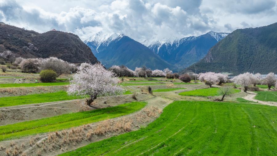 A drone photo taken on April 3, 2026 shows peach blossoms at the foot of Mount Namcha Barwa in Nyingchi City, southwest China's Xizang Autonomous Region. (Xinhua/Tenzin Nyida)
