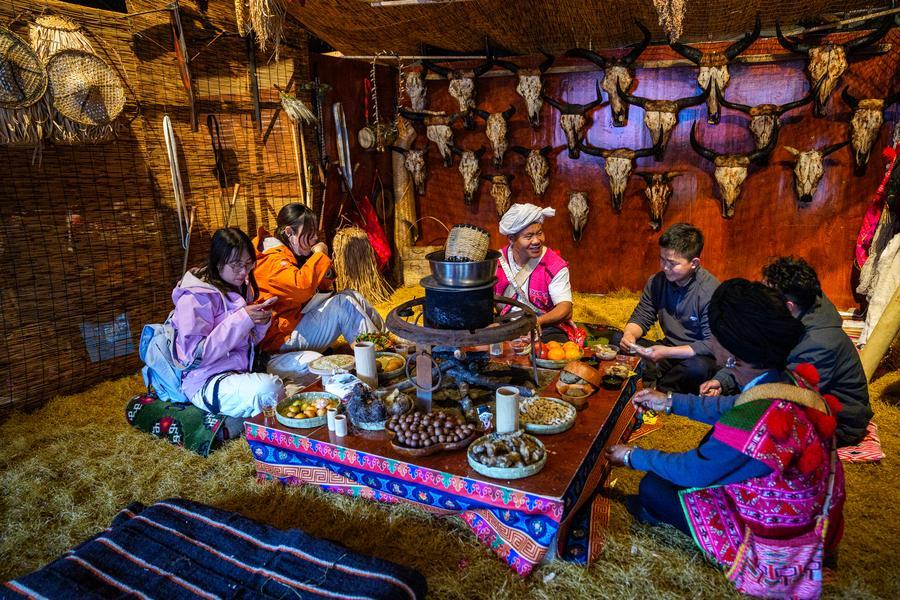 Tourists have fun in a tent themed on local folk culture at a fair in Nyingchi City, southwest China's Xizang Autonomous Region, April 3, 2026. (Xinhua/Tenzin Nyida)