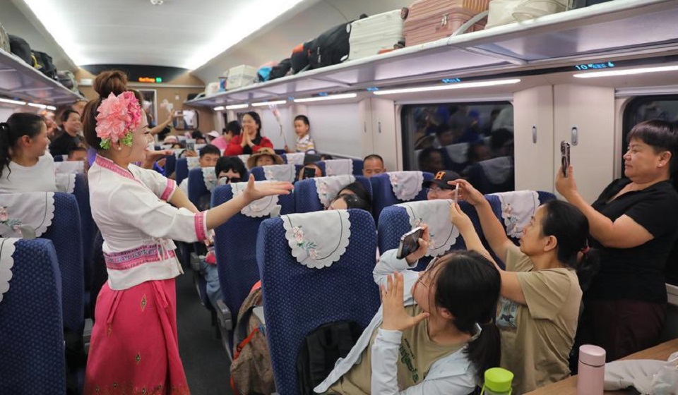 Stewardesses interact with passengers aboard train No. D86 from Kunming, capital city of southwest China's Yunnan Province, to the Lao capital Vientiane, July 18, 2025. (Photo by Yang Zixuan/Xinhua)