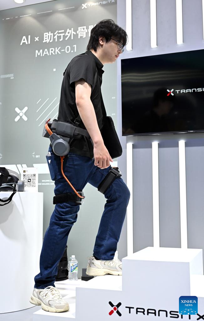 A visitor experiences an AI-powered exoskeleton during the sixth China International Consumer Products Expo (CICPE) in Haikou, south China's Hainan Province, April 14, 2026. The ongoing sixth CICPE features groundbreaking innovations in artificial intelligence (AI). A wide range of new tech consumer products are showcased at the event, spanning multiple sectors including smart interaction, wearable devices, and smart healthcare. (Xinhua/Guo Cheng)