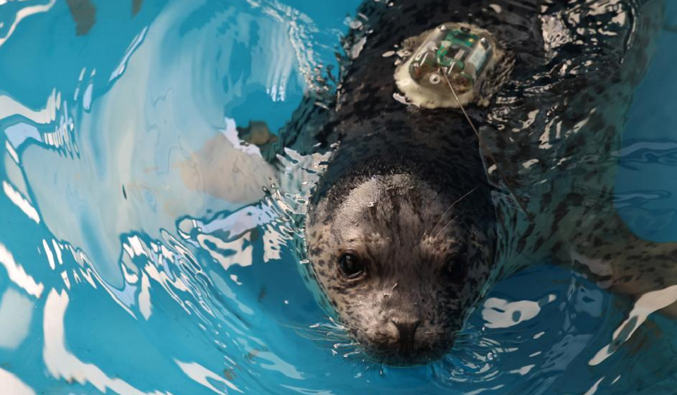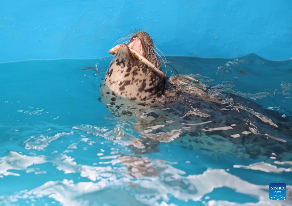 A spotted seal, wearing a monitoring and tracking tag on its back, swims in a pool before being released at the Liaoning Ocean and Fisheries Science Research Institute in Dalian, northeast China's Liaoning Province, April 15, 2026. Five spotted seals were released into waters off the coast of Dalian on Thursday. Three of them were rescued and rehabilitated by the Liaoning Ocean and Fisheries Science Research Institute, while the other two were artificially bred by Sunasia Ocean World in Dalian.