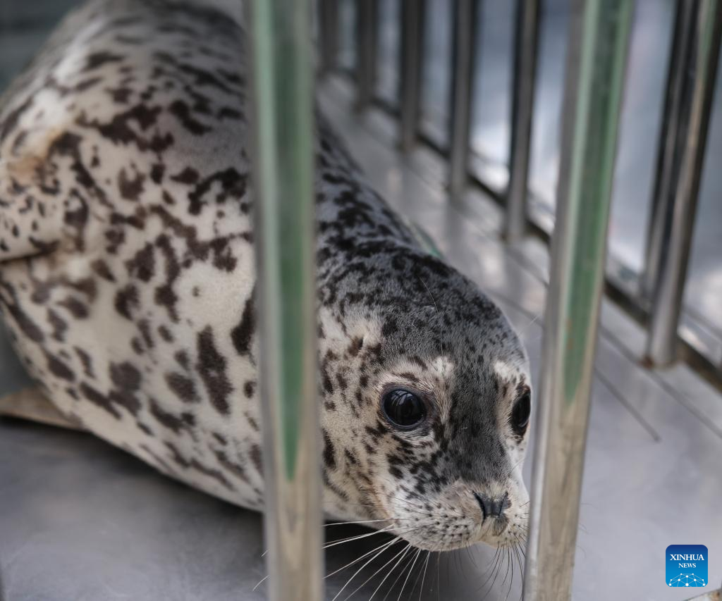 A spotted seal is pictured before being released in Dalian, northeast China's Liaoning Province, April 16, 2026. Five spotted seals were released into waters off the coast of Dalian on Thursday. Three of them were rescued and rehabilitated by the Liaoning Ocean and Fisheries Science Research Institute, while the other two were artificially bred by Sunasia Ocean World in Dalian.