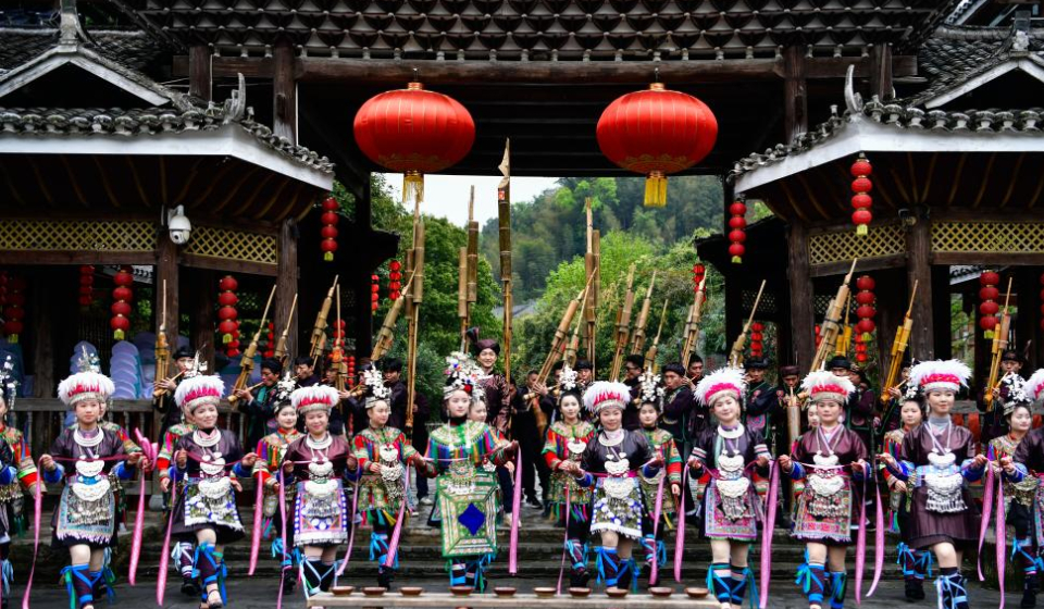 Staff members of a restaurant perform for tourists in Zhaoxing Dong Village of Liping County, southwest China's Guizhou Province, April 20, 2026.