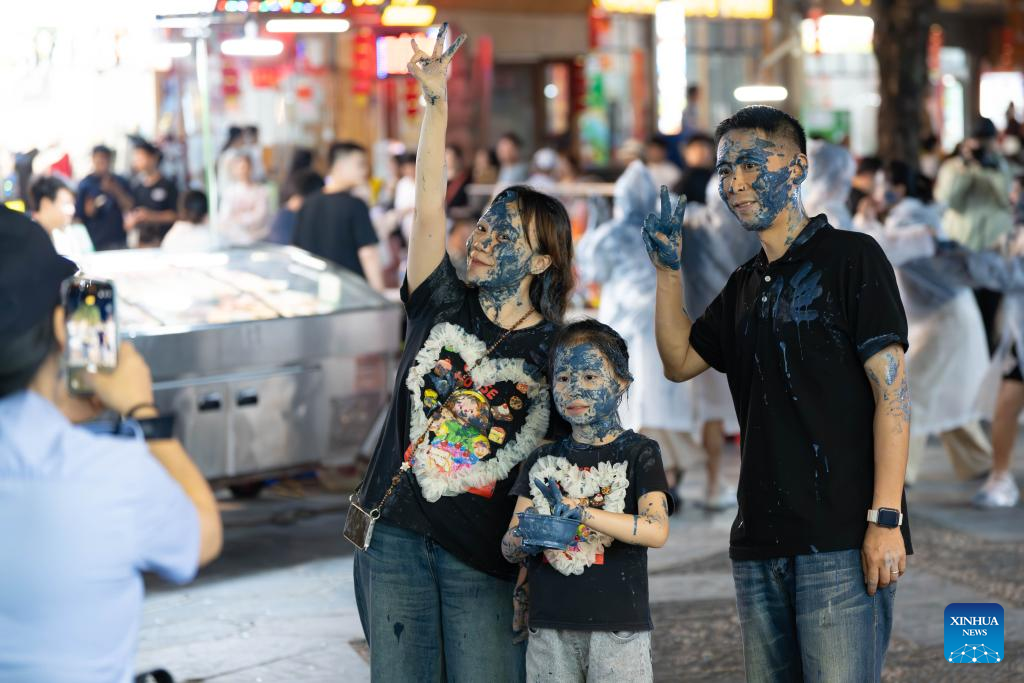 Tourists pose for photos during a folk activity in Zhaoxing Dong Village of Liping County, southwest China's Guizhou Province, April 18, 2026.