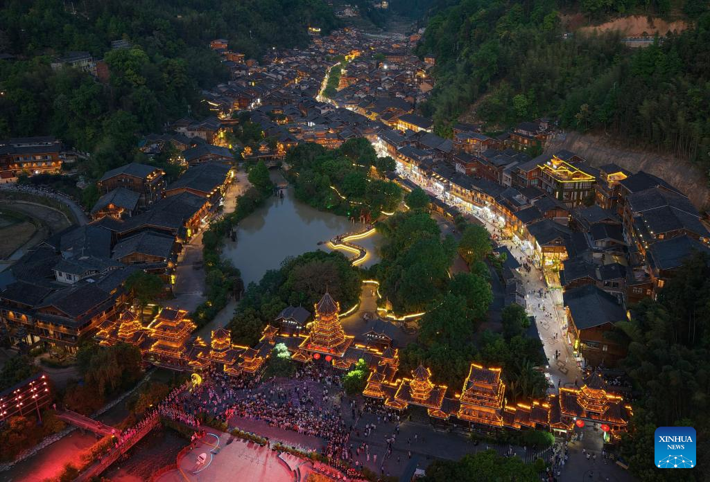 An aerial drone photo taken on April 18, 2026 shows tourists enjoying a performance in Zhaoxing Dong Village of Liping County, southwest China's Guizhou Province.