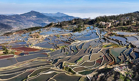 Hani Rice Terraces shimmer in water-filled season in SW China's Yunnan